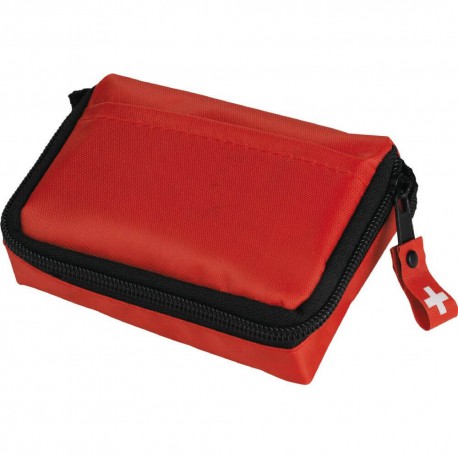 First aid kit includes 5 adhesive bandages, 4 alcohol pads, paper tape roll, 2 safety pins, 5 gauze pads, 1 gauze roll, 1 triangular bandage and scissors in case. --Undecorated Stock Available in 5 Working Days--