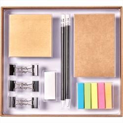 The Multi-Desktop Set includes 1-piece mechanical pencil, 1-piece ballpoint pen, 1-piece eraser, 1-piece color matching notepad and sticker, and small sticky flag in 5 colors.