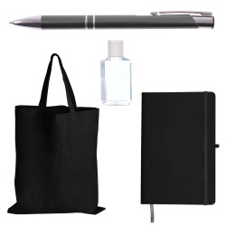 Tradeshow pack of short handle cotton bag, hand sanitiser, napier pen and and venture Supreme Notebook.