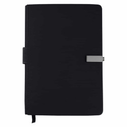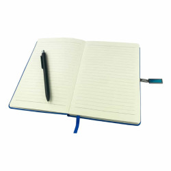 Promotional A5 size premium quality notebook with a thermo debossing PU leather cover, a remarkable two-tone debossing logo. It comes with an elastic pen loop(without pen) on the side which can hold any pens. It has a book mark ribbon and magnetic metal flip closure which can be laser engraved or domed label, contains 100 leaves (200 pages) of 80gsm lined paper. A great high level premium corporate gift.