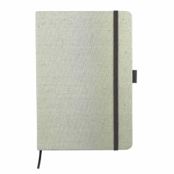 A5 cotton cover notebook with coloured elastic band closure, it has 96 leaves(192 pages) of 70gsm recycled lined paper and an elastic loop to hold a pen(pen is not included).