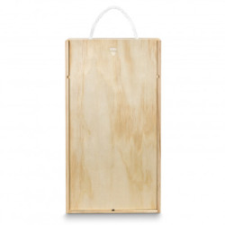 Elegant wine gift box made from natural pine wood with a sliding lid that offers a large branding area. The box is designed to hold two standard wine bottles and has built-in dividers with shredded paper filling. A woven rope handle makes it easy and comfortable to carry.