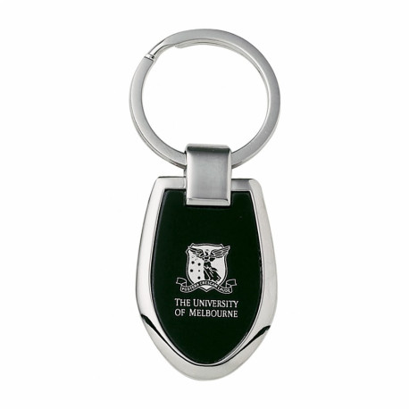 Shiny silver shield keyring with matt black centre. Supplied in black box. Laser engraving recommended. Printing will fade over time.