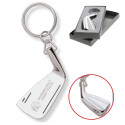 A polished chrome metal golf club/wedge shaped keychain. Laser engraving recommended. Printing will fade over time.