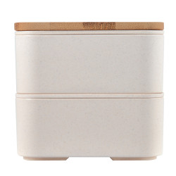 2 tier, lunch box with knife, fork and spoon retained in the middle compartment. Made from a 50% blend of wheat fibre and BPA free polypropylene. 2 compartments allows you to separate your meal. Elastic strap holds the compartments together. Bamboo lid great for easy food preparation. Ideal for lunch on the go. An eco friendly alternative as zero waste and great alternative to plastic wear. Suitable for reheating food in microwave, not cooking. For logo longevity hand washing is recommended. Eco Credentials: Wheat fibre - by product, reusable, printed using reusable energy.