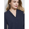 Sophisticated fashion forward design elevates your uniform,Soft petal-shaped lapel creates elegance at the neckline,Inverted back pleat for ease and flow,Loose-fitting silhouette with extended length,Designed to be worn un-tucked. Fabric: Easy Care 100% Mechanical Stretch Polyester.
