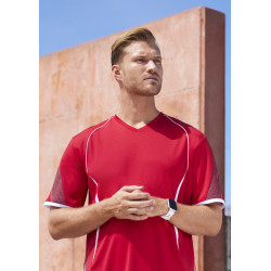 Grid mesh underarm panels for breathability,Unique sleeve print feature,Contrast panels and piping,Self-fabric V-Neck binding. Fabric: 100% BIZ COOL Polyester Sports Interlock,155 GSM,UPF rating - Excellent.
