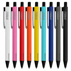 Popular smart and concise design with soft-touch rubberized aluminum metal pen, a selection of 9 colours, black plastic tip, push button, and metal...