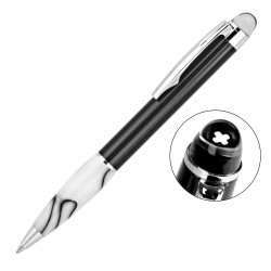 Push button ballpoint pen with black ink and black stylus. Aluminium soft feel barrel. Chrome clip and tip & highlight rings on the barrel. Writing...