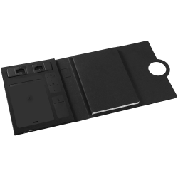 Made from thermo PU and comes with wireless phone charging stations outside and inside the front cover. Input and output 5V 2A and wireless output 5V 1A . Supplied in a black gift box. The light up front circular panel is perfect for showcasing your logo.