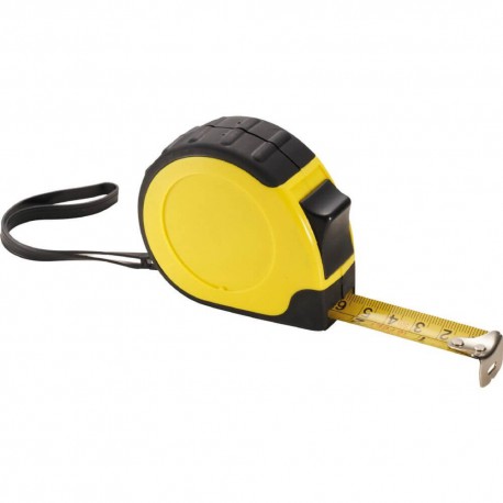 Sixteen-foot retractable metal tape (inch and metric measurements). Lock button. Rubber casing with wrist strap. Metal belt clip.