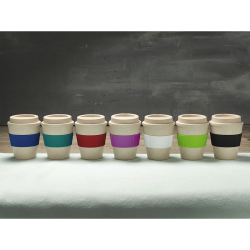 This practical design of a reusable coffee cup is 350ml and comes with a heat resistant ribbed silicone band with a flat section for decoration. Made from 50% bamboo and 50% polypropylene.