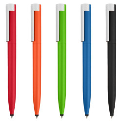 A design of broad printing area on clip, solid glossy white clip with satin finish barrel. Twist action and a stylus for touch screen, high quality Parker-Type German manufactured black ink refill, 1800 meters writing distance, tungsten carbide ball provides you with quality writing.