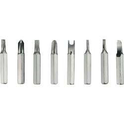 Includes 2 Phillips bits, 3 star head bits, 1 flathead bit, 1 bent flathead bit, and 1 spanner bit. Twist-off cap for bit storage. Magnetic base. Durable metal clip. Laser engraving recommended.